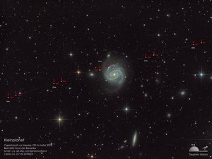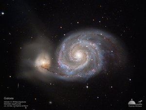Im Vergleich zur vorherigen Aufnahme des Virgo-Galaxienhaufens ist M 51 deutlich näher gelegen. Die Entfernung dieser Galaxie zu uns beträgt etwa 24 Millionen Lichtjahre. Wir sehen dabei direkt von oben auf die Galaxie drauf. Neben den Spiralarmen sind in diesen eine ganze Reihe von kleinen roten Fleckchen zu erkennen. Dies sind Gasnebel, wie wir sie als Sternentstehungsgebiete auch in unserer Milchstraße kennen. Die Vielzahl dieser Nebel zeigt, dass M 51 eine sehr aktive Galaxie mit einer hohen Sternentstehungsrate ist. Dies kommt nicht von ungefähr, denn M 51 steht nicht für sich alleine im Weltall. Dicht an ihr dran (im Bild links der Hauptgalaxie) befindet sich eine kleinere Begleitgalaxie. Diese zieht seit einigen Millionen Jahren an M 51 vorbei. Durch ihre gegenseitige Schwerkraft bringen sich die beiden Galaxien gehörig durcheinander. Sterne werden aus den Galaxien herausgerissen und sammeln sich zu Wolken (z. B. als diffuser Schimmer oberhalb der Begleitgalaxie zu sehen). Und die in den Galaxien vorhandenen Gaswolken werden zusammengedrückt, wodurch die Sternentstehung angefacht wird.