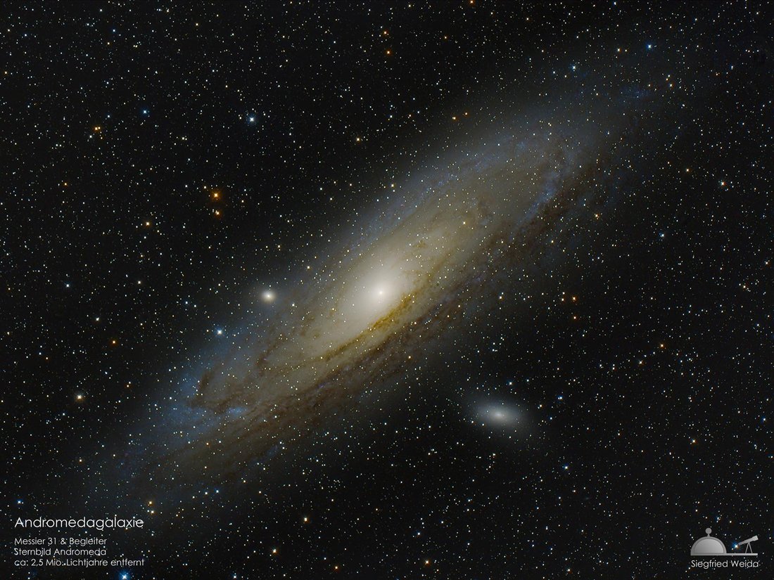 Auch wenn das hier gezeigte Objekt den Namen „Andromedanebel“ trägt, handelt es sich nicht um einen Gasnebel wie beim vorher gezeigten Orionnebel. Vielmehr sehen wir hier eine Galaxie aus etwa 200 Milliarden Sterne, ähnlich wie unsere Milchstraße.