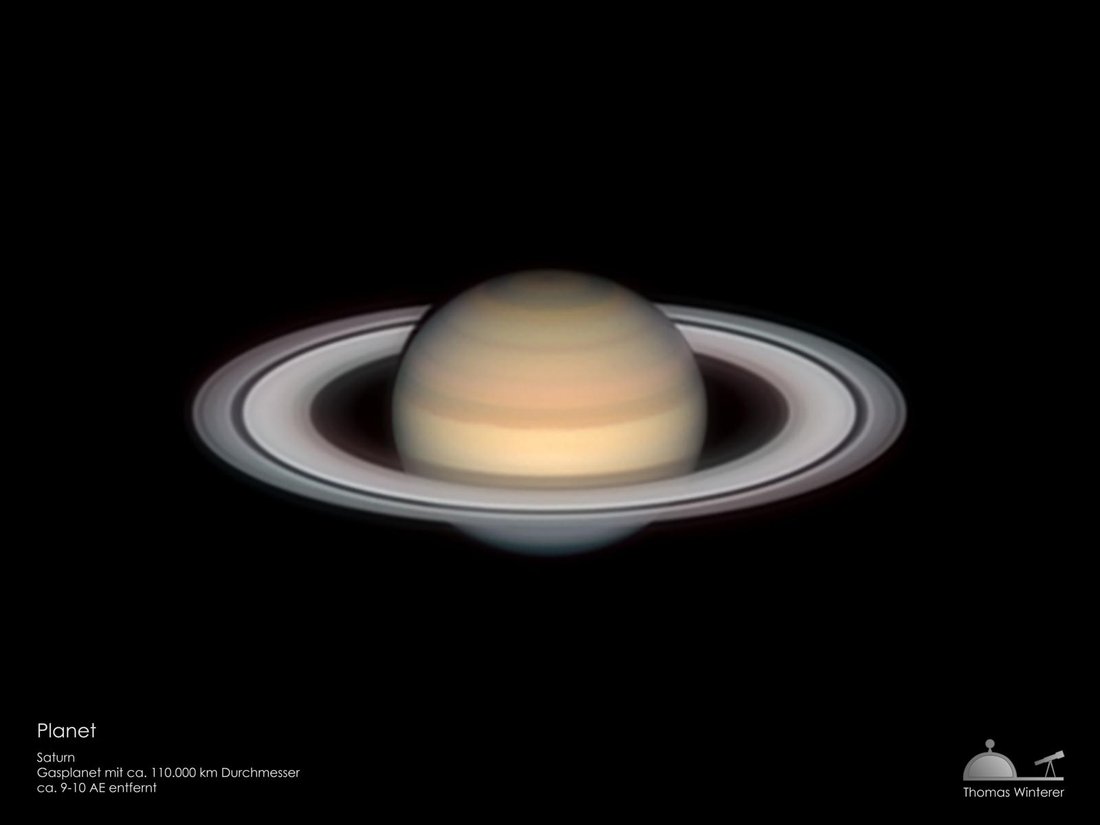 Noch weiter von uns entfernt wie Jupiter ist der Ringplanet Saturn. Er ist etwas kleiner und „leichter“ als Jupiter (95 Erdmassen). Was bei ihm sofort auffällt, ist sein prächtiger Ring, der ihn umgibt. Dieser ist kein fester Körper, sondern besteht aus unglaublich vielen kleinen Gesteins- und Eisbrocken, die um den Saturn kreisen.