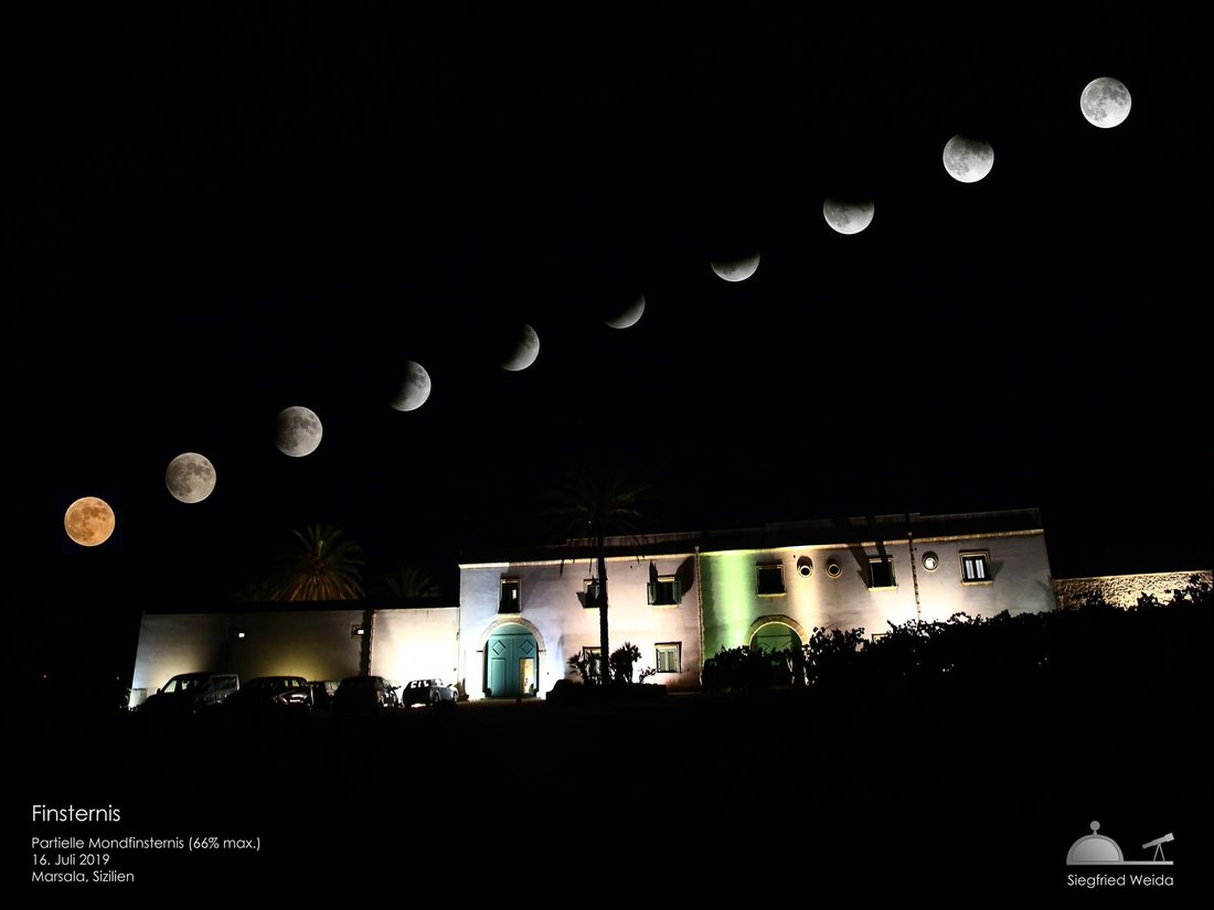 Die hier gezeigte Reihenaufnahme zeigt den Verlauf der Finsternis vom 16. Juli 2019. Links geht der Mond auf, und wandert dann – langsam höher ziehend – immer weiter in den Schatten der Erde. Jedoch wird er nicht ganz verfinstert: ein kleiner Teil bleibt weiterhin sichtbar, bis er dann wieder aus dem Schatten wandert und dann wieder ganz beleuchtet ist.
