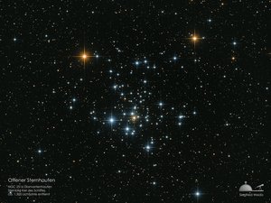Der prominenteste und hellste Sternhaufen, den man am Sternhimmel in Diedorf sehen kann, ist auf der Aufnahme hier gezeigt. Er trägt den Namen „Plejaden“, „Siebengestirn“ oder auch seine Katalogbezeichnung Messier 45. Oftmals wird er von Besuchern mit dem Sternbild Kleiner Wagen verwechselt, da seine Sterne tatsächlich die Form eines kleinen Wagens bilden.