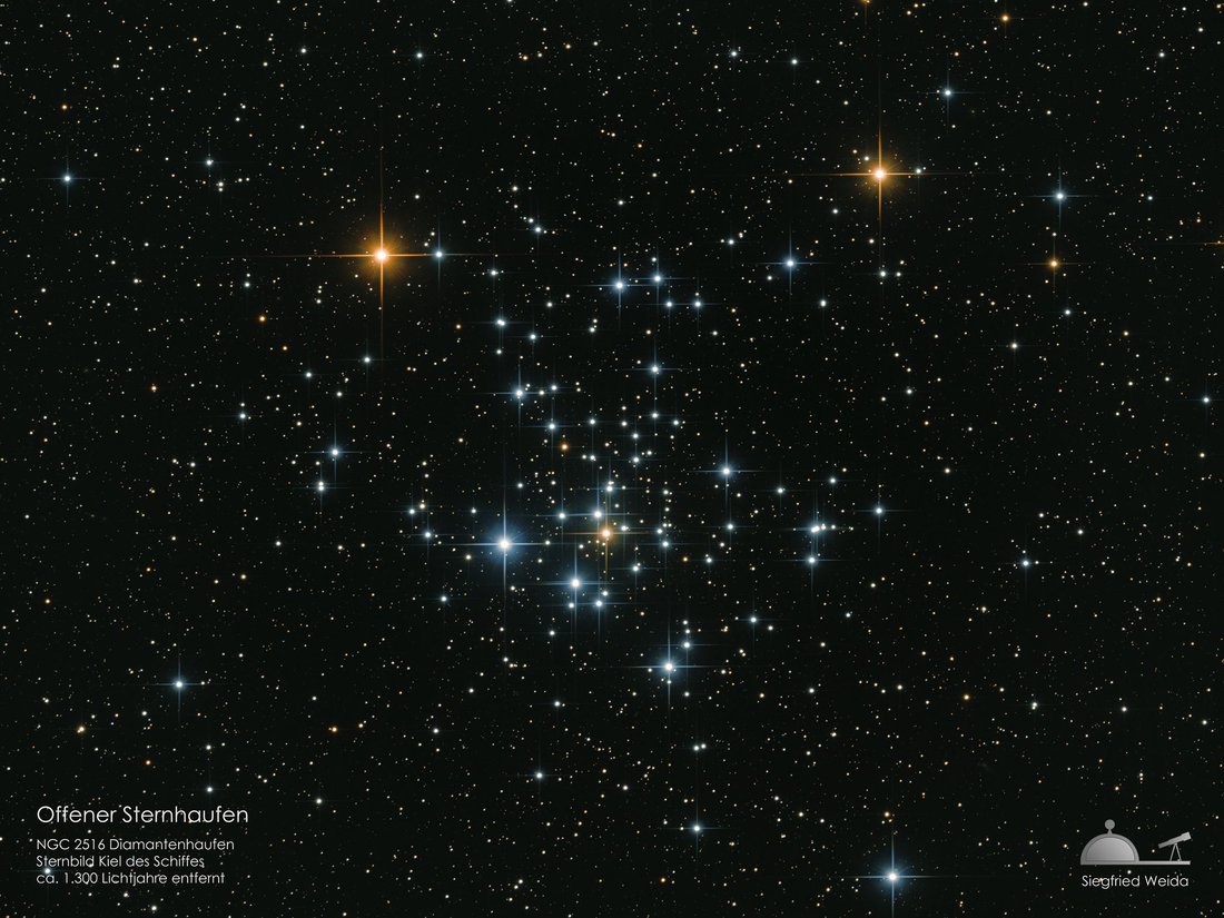 Im Gegensatz zu den Kugelsternhaufen sind die Offenen Sternhaufen meistens sehr junge Objekte, die sich aus einer Gaswolke von einigen Millionen Jahren gebildet haben. Auch besitzen sie deutlich weniger Sterne. Im Falle des hier gezeigten NGC 2516 sind es etwa 80 Sterne, die in einer Entfernung von 1.300 Lichtjahren von uns sind.