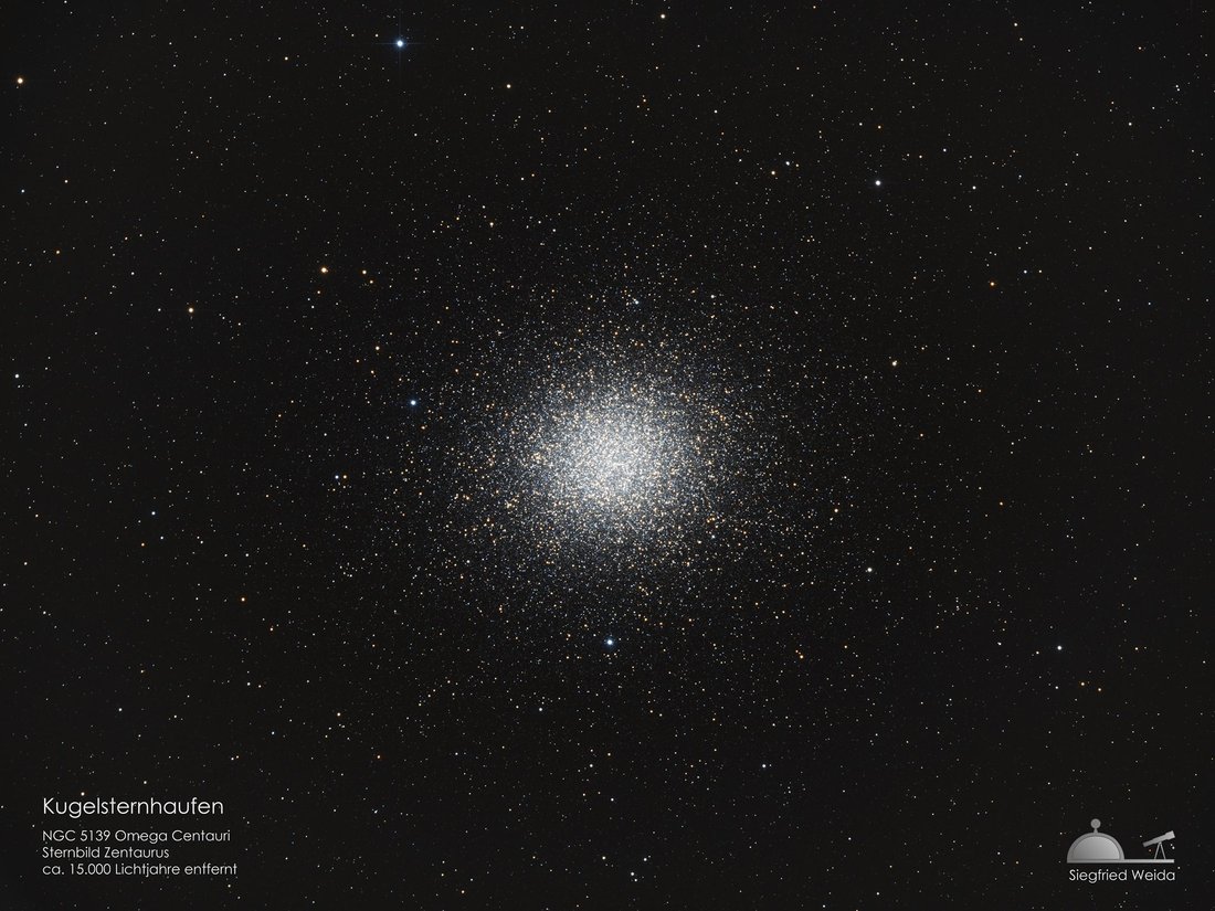 In einer Wolke, die sich weit draußen um die Milchstraße zieht, befinden sich sehr alte und große Objekte: die Kugelsternhaufen. Der hellste dieser Haufen ist hier abgebildet. Er trägt die Katalogbezeichnung NGC 5139. Da er auch mit bloßem Auge zu sehen ist, wurde er früher für einen Stern gehalten, und bekam die Bezeichnung w (sprich: Omega) Centauri.