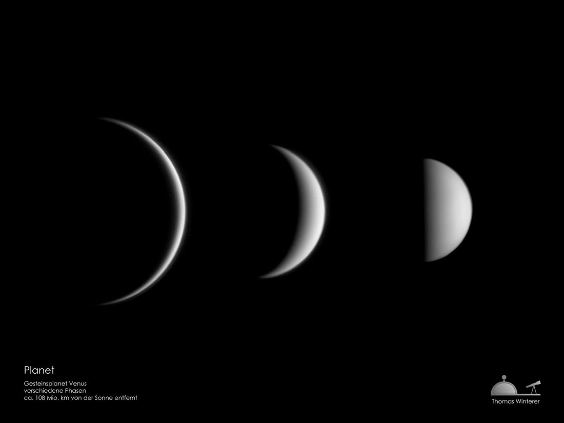 Die Ursache der Phasen ist jedoch die gleiche wie beim Mond: Sonne, Erde und Venus stehen in einem sich verändernden Winkel zueinander. Bei „Halbvenus“ (rechts) ist dieser Winkel 90°, und wird immer spitzer, je dünner die Sichel erscheint. Dabei verändert die Venus auch ihren Abstand zur Erde und wird dadurch scheinbar größer.