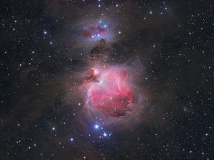 Der uns nächste dieser Gasnebel in unserer Milchstraße, der hier auf der Aufnahme zu sehen ist, befindet sich im Sternbild Orion. Er ist bereits mit bloßem Auge oder einem kleinen Fernglas zu sehen. In den Fernrohren der Sternwarte bietet er im Winter einen prächtigen Anblick.