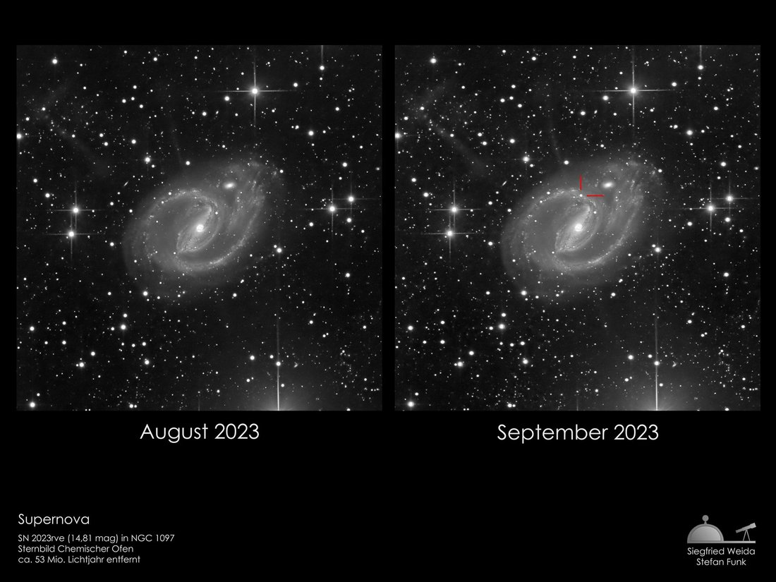 Im Jahr 2023 hatten wir Glück: in der nur 45 Millionen Lichtjahre entfernten Galaxie NGC 1097 ereignete sich eine solche Explosion. Auf der Aufnahme rechts vom September 2023 ist die Explosion markiert. Auf der linken Aufnahme einen Monat zuvor fehlt sie hingegen.
