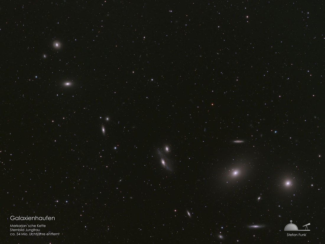Galaxien stehen praktisch nie alleine im Universum. Vielmehr bilden sie kleinere Gruppen, die sich dann zu Galaxienhaufen zusammenballen. Im Falle des Virgo-Haufens dürfte dieser aus mehreren Tausend Galaxien bestehen, von denen einige Dutzend auf der Aufnahme hier zu sehen sind. Für ihre Beobachtung benötigt man auf alle Fälle ein Teleskop.