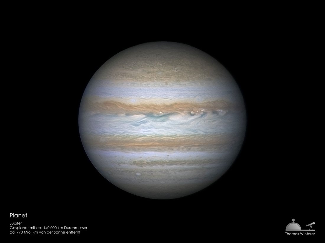 Auch hier sehen wir nicht auf die Oberfläche des Planeten hinunter: Jupiter besteht zum größten Teil aus Gas (Wasserstoff, Helium, Methan und andere Kohlenwasserstoffe). Er dreht sich rasend schnell um seine eigene Achse. Für einen Jupitertag braucht es nur etwas mehr als 10 Stunden. Dadurch verwirbelt das Gas seiner Atmosphäre ständig, und bildet Wolkenbänder, Stürme und kleinere Wirbel (die auch schon mal so groß wie unser Mond werden können).