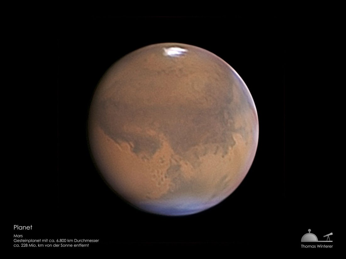 Tatsächlich ist der Mars ein kalter und knochentrockener Planet. Das Eis der Polkappen besteht zum größten Teil aus gefrorenem Kohlendioxid, was auf Temperaturen um die minus 100°C hindeutet. Selbst am Äquator wird es kaum 0°C warm. Und da er nur eine sehr dünne Atmosphäre besitzt, ist auch bei ihm sein Wasser im Laufe der Jahrmilliarden seit seiner Entstehung ins Weltall verflogen. Tatsächlich gab es früher auf dem Mars sogar fließendes Wasser. Raumsonden, die ihn in den letzten Jahrzehnten umkreisten und sogar auf ihm landeten, fanden zahlreiche Flusstäler und Sedimente. Diese Phase des Planeten ist jedoch schon lange vorbei. Ob sich jemals Leben auf ihm entwickeln konnte, oder ob sich primitive Einzeller und Bakterien auch heute noch auf ihm befinden, konnte bislang noch nicht abschließend geklärt werden.