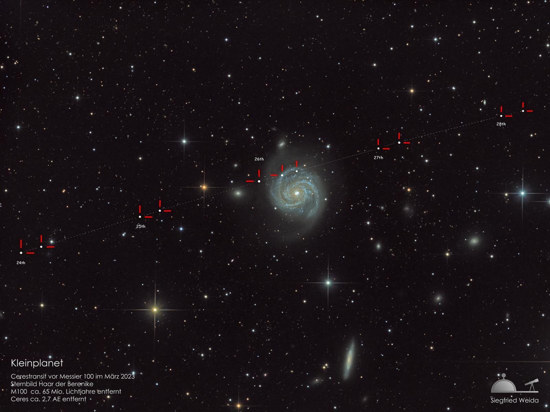 Ceres ist etwa 1.000 km groß und somit der größte Asteroid. Sie zieht wie die Planeten im Laufe von einigen Wochen vor dem Fixsternhimmel vorbei. Da sie jedoch viel schwächer als die Planeten ist, erscheint sie nur als kleines Sternchen. Auf der Aufnahme hier zog Ceres im Laufen einiger Tage vor der Spiralgalaxie Messier 100 vorbei. Die Entfernungsunterschiede der beiden Objekte waren jedoch gewaltig: während Ceres nur 250 Millionen Kilometer von uns entfernt war, waren es bei Messier 100 gewaltige 55 Millionen Lichtjahre!