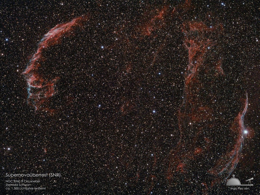 Nach der Explosion verteilen sich die äußeren Schichten des Sterns mit großer Geschwindigkeit im Weltall. Die hier gezeigte Aufnahme des Cirrusnebels zeigt diese Gasschwaden, bestehend vor allem aus Wasserstoff, die sich seit etwa 8.000 Jahren auseinander bewegen. Trotz dieser langen Zeit bewegen sie sich immer noch mit etwa 100 Metern pro Sekunde weg vom Explosionsort und vermischen sich weiter mit dem interstellaren Gas der Milchstraße.