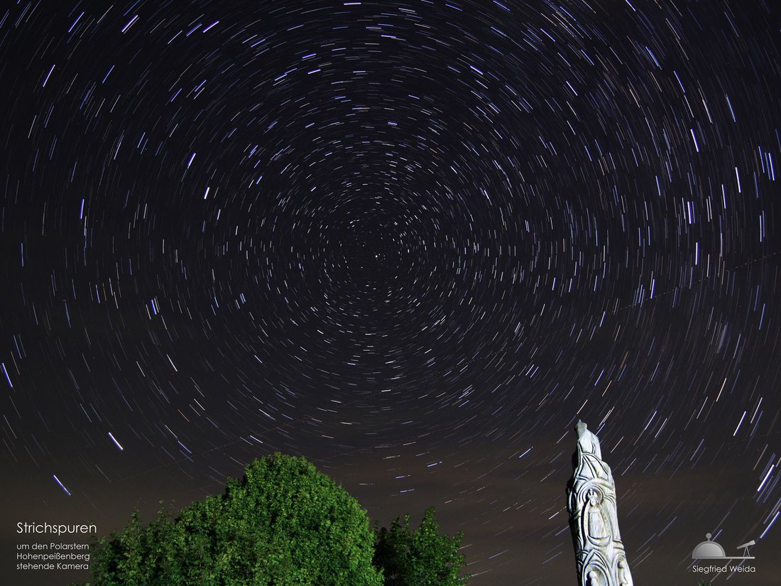 Richtet man seine Kamera auf den Himmelsnordpol und belichtet einige Zeit, so werden die Kreisspuren der Sterne sichtbar.